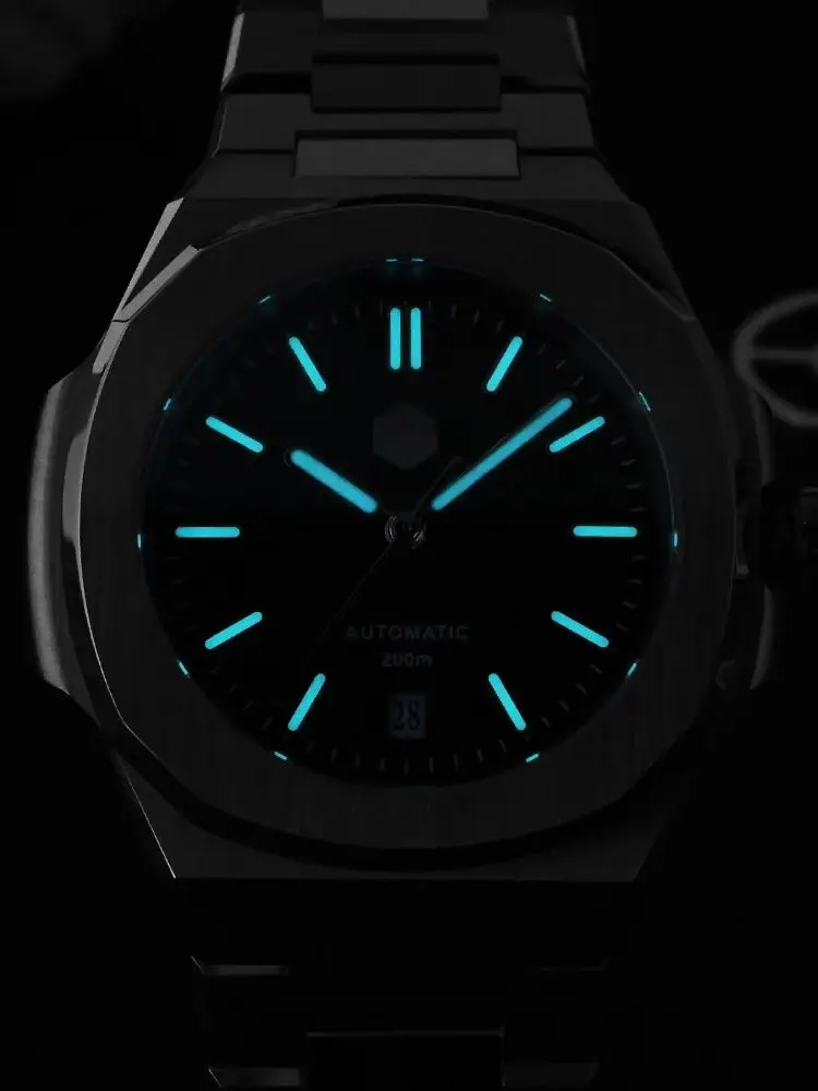 - الإضاءة: تستخدم مادة BGW-9 الزرقاء المضيئة على العقارب والعلامات لضمان قراءة واضحة في ظروف الإضاءة المنخفضة.
