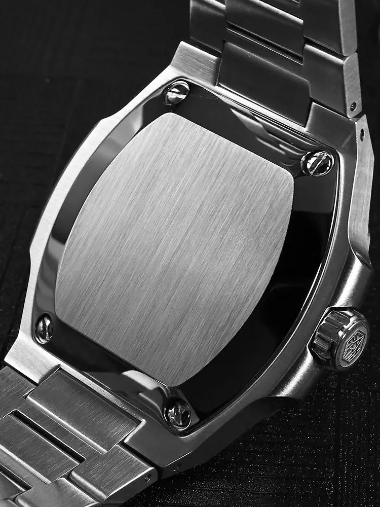 - السوار: يتوفر بخيارات مختلفة، بما في ذلك سوار صلب من الفولاذ المقاوم للصدأ 316L أو حزام مطاطي فاخر من FKM، وكلاهما مزود بمشبك فراشة مخفي بزر ضغط.