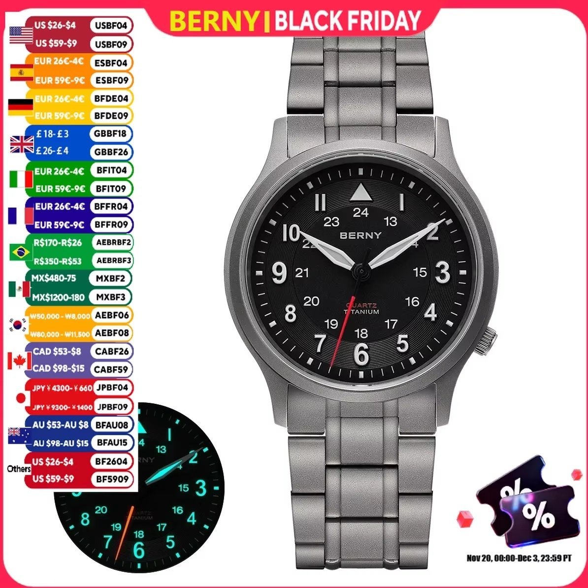 - الإضاءة: تتميز بعقارب وأرقام مضيئة للغاية (Super Luminous)،